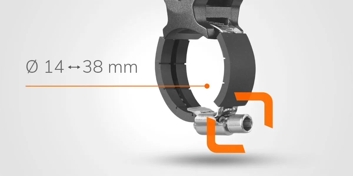 Il sistema a fascetta permette di coprire un range di misure di manubri da 14 a 34 mm. Rispetto a Belt lo spessore della fascetta è più sottile, solo 15mm, permette l’installazione in spazi più ristretti.