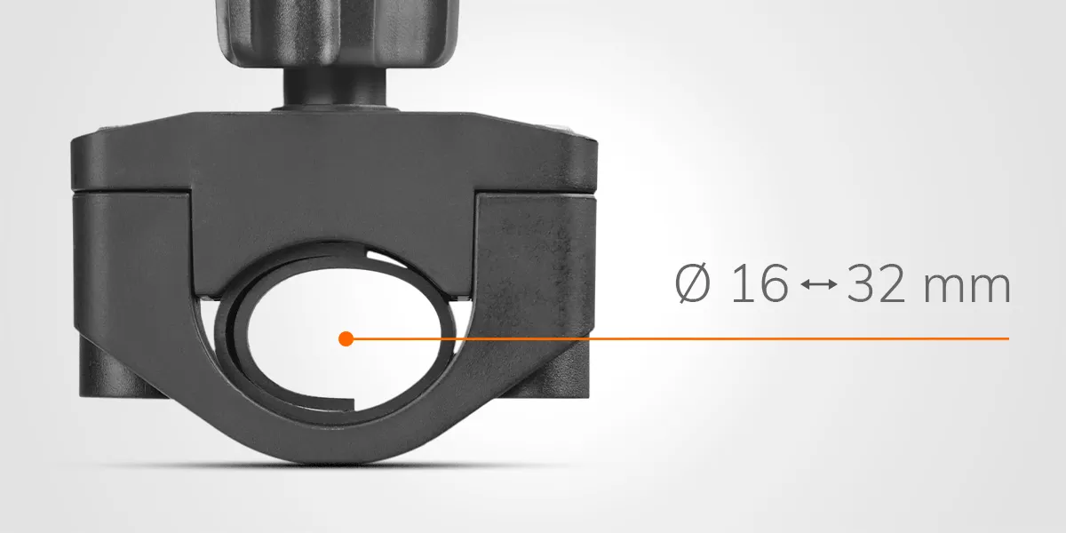 Le due parti del fissaggio unite formano un “anello” che permette di avvolgere manubri di diametro tra i 16 e 32 mm. La guarnizione in dotazione assicura una maggior aderenza ed evitando graffi sulla superficie del manubrio.